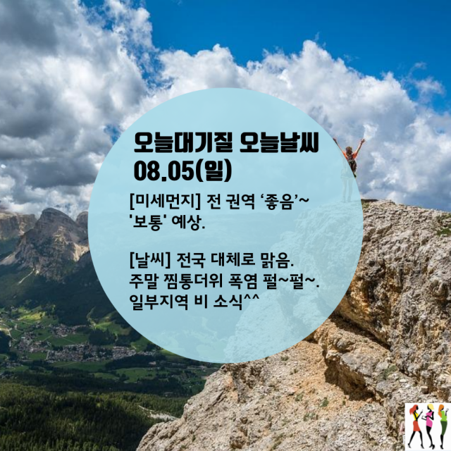 [#미세먼지] 전 권역 ‘좋음’~’보통’ 예상 [#날씨] 전국 맑음. 주말 찜통더위 폭염 펄~펄~. 일부지역 비 소식^^ 2018.08.05(일) #뉴미디어포털