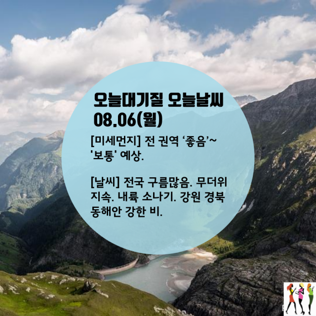 [#미세먼지] 전 권역 ‘좋음’~’보통’ 예상 [#날씨] 전국 구름많음. 무더위 지속. 내륙 소나기. 동해안 강한 비. 2018.08.06(월) #뉴미디어포털 #건강핫팁