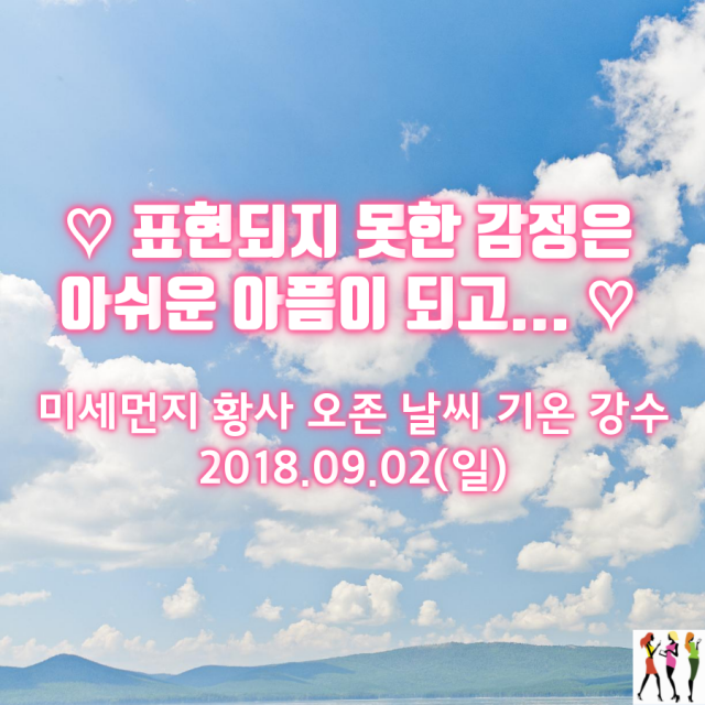 [#미세먼지] 전 권역 ‘좋음’ [#오존] 전 권역 ‘보통’ [#날씨] 전국 구름 많음. 제주 비. 2018.09.02(일)