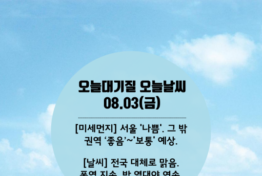 [#미세먼지] 서울 ‘나쁨’. 그 밖 권역 ‘좋음’~’보통’ 예상 [#날씨] 전국 맑음. 폭염 지속. 밤 열대야 연속. 2018.08.03(금) #뉴미디어포털