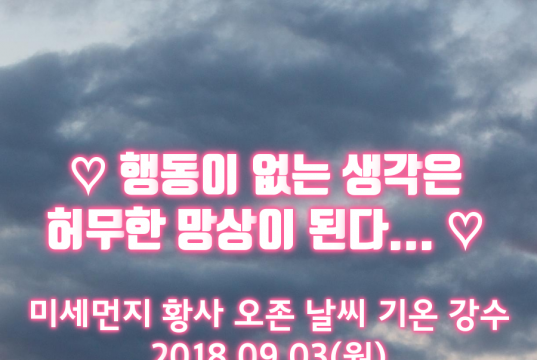 [#미세먼지]전 권역 ‘좋음’ [#오존]전 권역 ‘보통’ [#날씨]전국 흐리고 비. 중부 경북 국지성 집중호우. 2018.09.03(월)