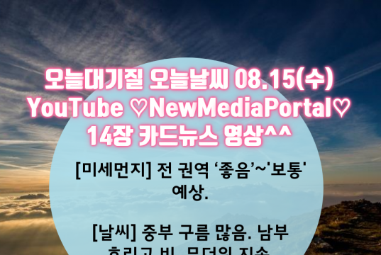 2018.08.15(수) [#미세먼지] 전 권역 ‘좋음’~’보통’ 예상 [#날씨] 중부 구름 많음. 남부 흐리고 비. 무더위 지속. #뉴미디어포털 #건강핫팁